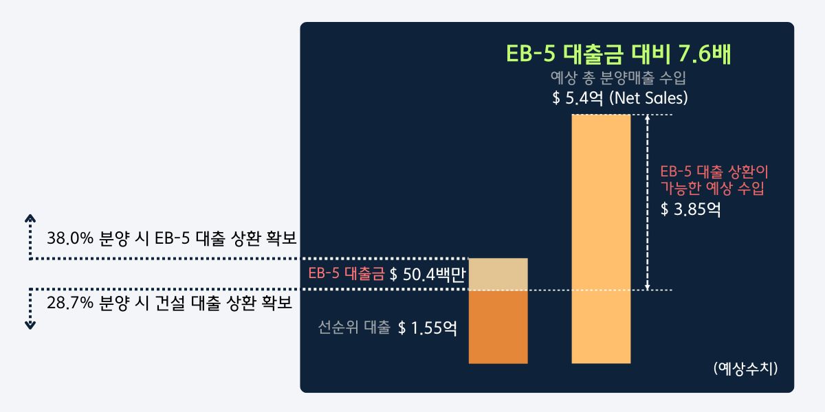 • EB-5 대출 상환 전 배당 및 EB-5 대출기관 동의없이 재융자 또는 추가 대출이 불가합니다.